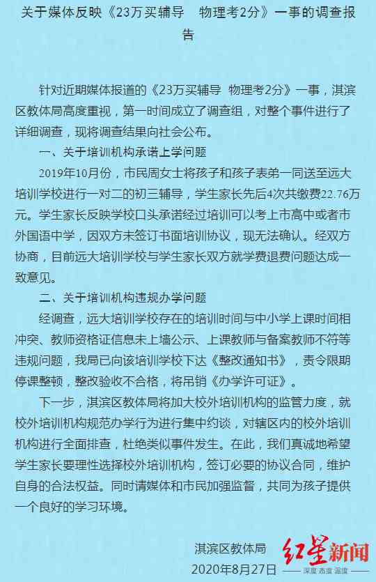 据“鹤壁市淇滨区教体局”微信消息,针对近期媒体报道的《23万买辅导 物理考2分》一事,河南淇滨区教体局高度重视,第一时间成立了调查组,对整个事件进行了详细调查,现将调查结果向社会公布。 一、关于培训机构承诺上学问题 2019年10月份,市民周女士将孩子和孩子表弟一同送至远大培训学校进行一对二的初三辅导,学生家长先后4次共缴费22.76万元。学生家长反映学校口头承诺经过培训可以考上市高中或者市外国语中学,因双方未签订书面培训协议,现无法确认。经双方协商,目前远大培训学校与学生家长双方就学费退费问题达成一致意见。 二、关于培训机构违规办学问题 经调查,远大培训学校存在的培训时间与中小学上课时间相冲突、教师资格证信息未上墙公示、上课教师与备案教师不符等违规问题,教体局已向该培训学校下达《整改通知书》,责令限期停课整顿,整改验收不合格,将吊销《办学许可证》。