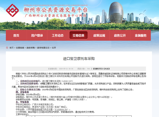 广西柳州市公安局交警支队斥资132万购置3辆进口警卫摩托车,引发质疑。 9月18日,柳州市公安局交警支队宣传科一名工作人员告诉澎湃新闻,交警支队采购的警卫摩托车用于出警巡逻。 澎湃新闻注意到,柳州市公众资源交易平台官网曾于今年5月21日发布一则《进口警卫摩托车采购》的中标结果公告。该采购项目的名称和编号为进口警卫摩托车采购(LZG20-037)。 前述公告显示,国鼎和诚招标咨询有限公司受柳州市公安局交通警察支队的委托,于今年4月30日采用公开招标方式采购3辆进口警用摩托车。广西大本商贸有限公司为中标供应商,中标金额为1325000元。 9月18日下午,广西大本商贸有限公司一名工作人员向澎湃新闻证实,柳州公安局交警支队确实从大本商贸有限公司采购了三辆本田大贸摩托车,已经提货。前述工作人员还称,此类车型最高售价60多万元。 澎湃新闻注意到,柳州市公安局交通警察支队此前曾以987000元的价格采购3辆警卫摩托车。据柳州市公众资源交易平台官网2018年4月12日发布的《广西科联招标中心关于警卫摩托车采购项目(LZG18-057)中标公告》,广西科联招标中心受柳州市公安局交通警察支队的委托,于2018年4月9日就警卫摩托车采购项目采用公开招标方式进行采购。 该公告提及,采购项目为3辆警卫摩托车采购工作,经专家论证及政府管理部门同意,允许采购进口产品,采购预算为人民币99万元整。中标供应商为柳州市晓金摩托车销售服务有限公司,中标金额为987000元。