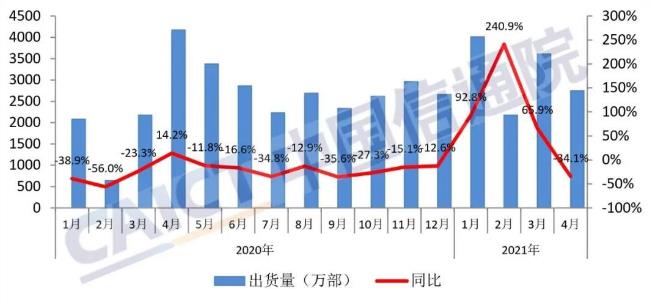 根据中国信通院公布的数据,2021年4月中国手机出货量同比下滑34.1%,很多人搞不清楚同比下降的意思,4月国内手机市场出货量下降34.1%、就是跟去年的4月份出货量相比下滑了34.1%,这个数字其实已经很夸张了。 当然,去年四月的情况比较特殊,它是最近两年来单月出货量最高的月份。 去年四月份武汉逐渐解封,压抑了两个多月的消费有个反弹,而且彼时恰逢华为P40系列、荣耀30系列等机型接连发布,诸多因素叠加在一起,共同刺激了消费才成就了这个发货量最高的4月份。