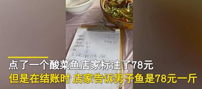 西藏自治区,男子在西藏珠穆朗玛峰景区一个川菜馆吃饭,点了一个酸菜鱼店家标注了78元,但是在结账时店家告诉男子鱼是78元一斤,端上桌的鱼有近3斤多重,结算下来为280元。男子称自己不是付不起钱,而是消费者应该有起码的知情权,在点菜时店家应该告知他鱼是按照78元一斤计算,而不是只标注了78元。