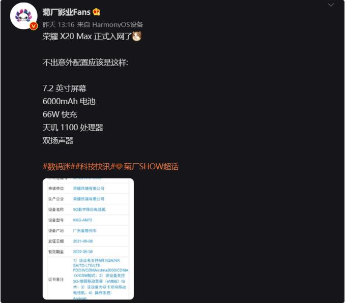 近日,荣耀新机X20 Max正式入网工信部,主打5G大屏,将搭载天玑1100处理器,7.2英寸屏幕,6000mAh大电池,并支持66W快充和双扬声器等。