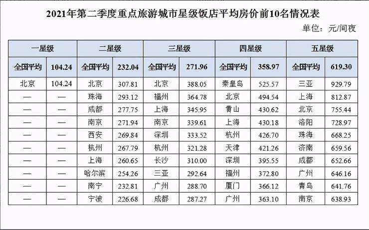 2021年二季度,全国三、四、五级饭店间夜平均房价分别为216.9元、326.71元和567.55元,五星级饭店的平均出租率为55.54%,高于三、四星级饭店。从出租率和价格看,我国部分地区一、二、三星饭店存在过剩情况,总体出租率偏低。 以各城市口径统计,三亚、上海、北京、洛阳、珠海等地的五星级饭店平均价格较高,其中三亚和上海分别高达929.79元每间夜和812.87元每间夜。四星级饭店中,秦皇岛、北京、黄山、上海、杭州、天津等城市表现最佳,均价都超过了400元每间夜。