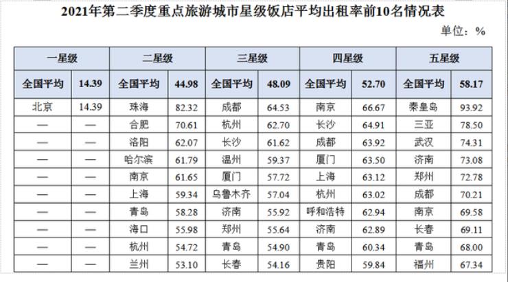 从五星级饭店的出租率来看,秦皇岛、三亚、武汉、济南、郑州、成都等城市超过了70%。可以发现,中东部地区一些旅游城市和省会城市的饭店入住情况较好,如上海、南京、厦门、杭州、青岛、长沙、成都等重点旅游城市四星、五星饭店的出租率均超过了60%。